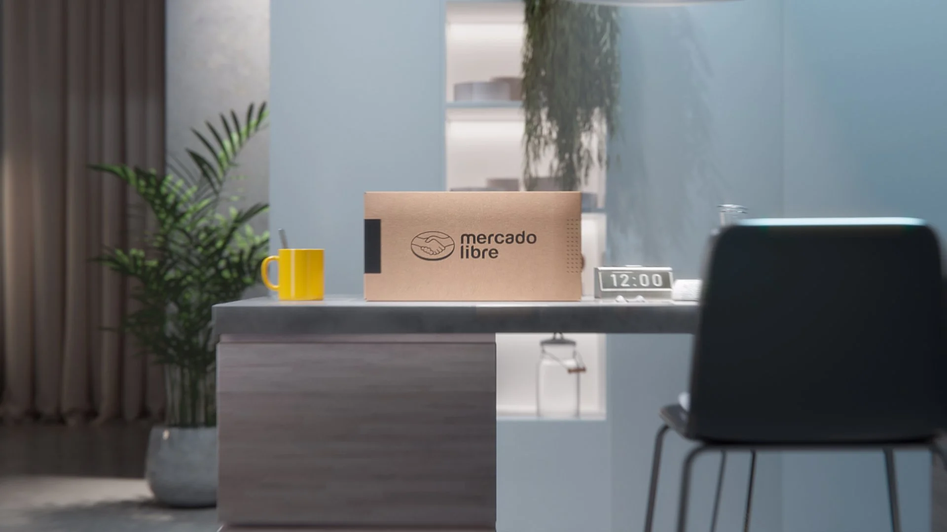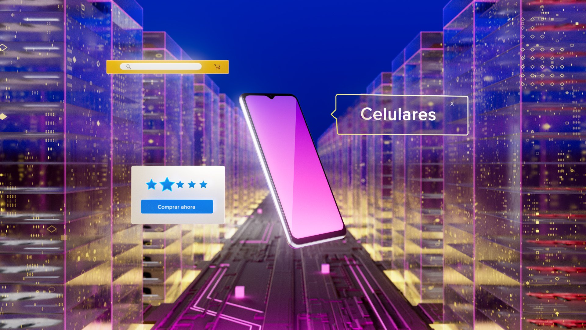 A digital playground. Neon lights, product worlds, and a rhythm that feels techy, fast, and fun — capturing the pulse of Mercado Libre online.