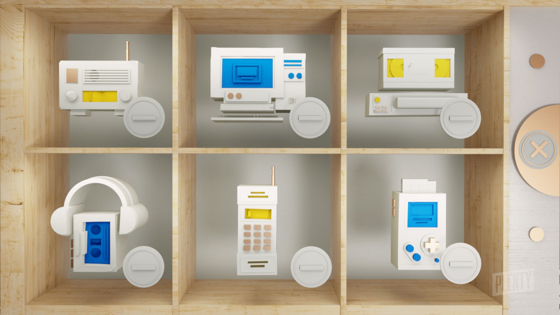 We go into and out from devices by playing with false perspectives, using a visual resource called graphic cubism in which objects can be turned 90 degrees without altering the layout or its legibility, but changing the aesthetic of the composition.